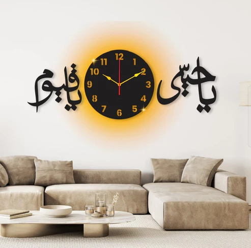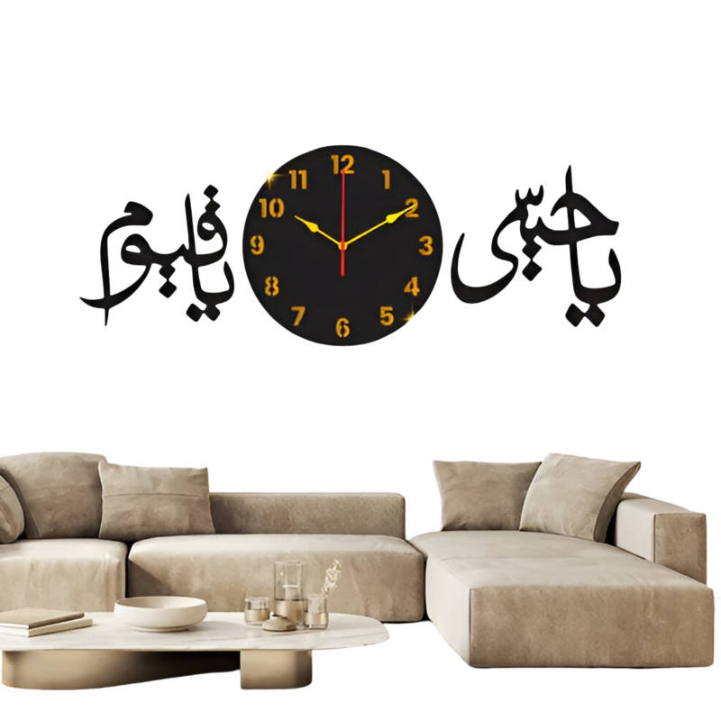 Bring divine beauty and meaning to your home with this elegant Islamic wall clock, engraved with the powerful names of Allah — Ya Hayyu Ya Qayyum.